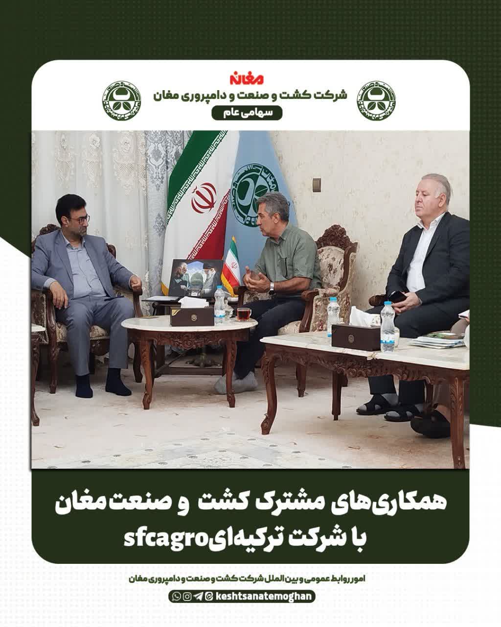 در دیداری که میان دکتر علی نظری شیخ احمد ، جانشین مدیرعامل شرکت کشت و صنعت و دامپروری مغان و مدیرعامل شرکت ترکیه‌ای sfcagro برگزار شد، طرفین بر توسعه همکاری‌های دوطرفه و استفاده از ظرفیت‌های بالقوه کشت و صنعت مغان تأکید کردند.