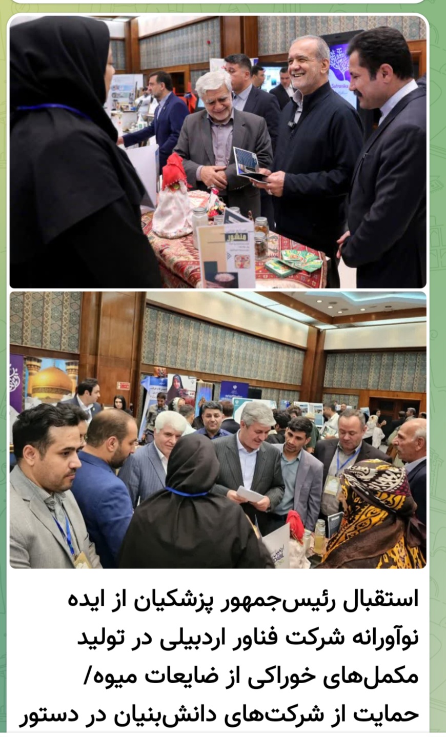 این شرکت بهعنوان یکی از واحدهای نوآور مستقر در استان اردبیل طرح خود را در زمینه تولید مکملهای خوراکی از ضایعات میوه طی بازدید رئیسجمهور پزشکیان و معاون توسعه روستایی و مناطق محروم رئیسجمهور از غرفه استان در نمایشگاه جانبی همایش روز ملی روستا و عشایر معرفی کرد.